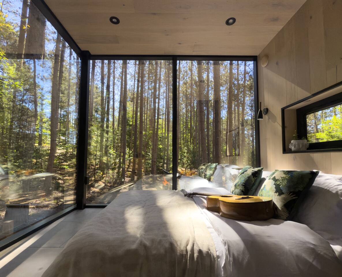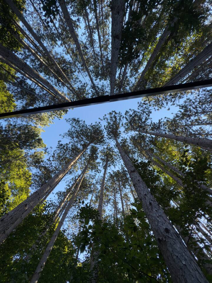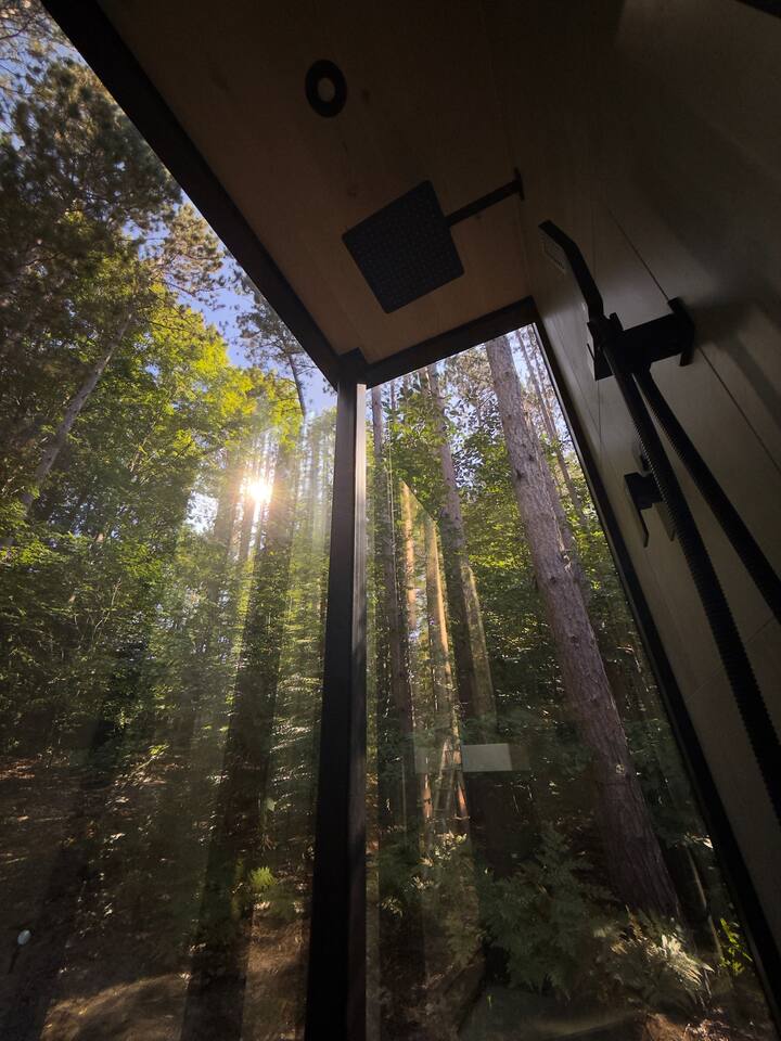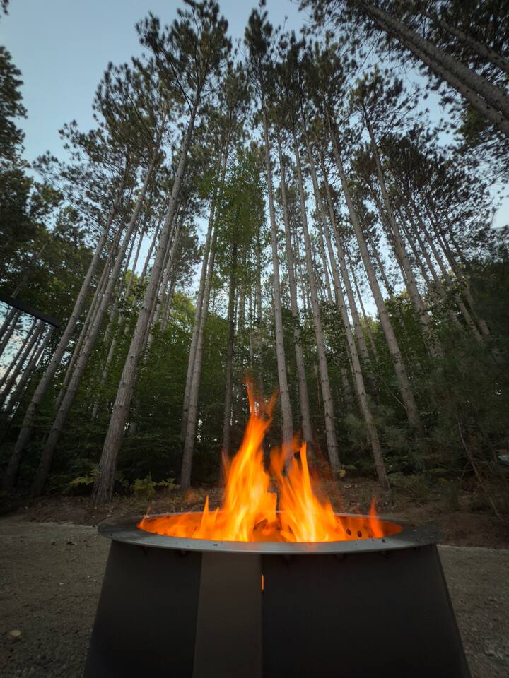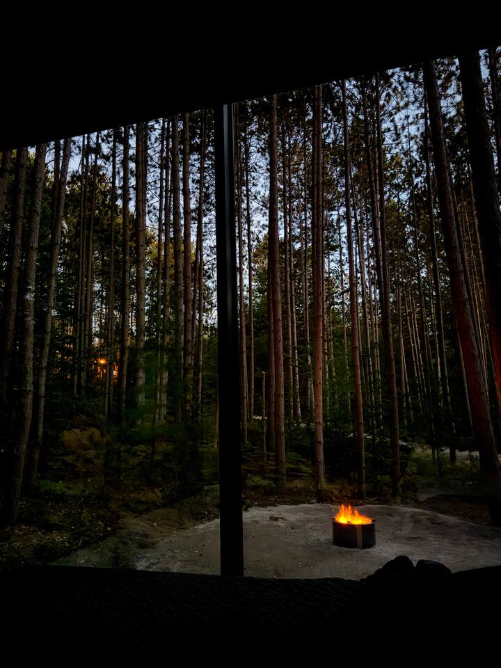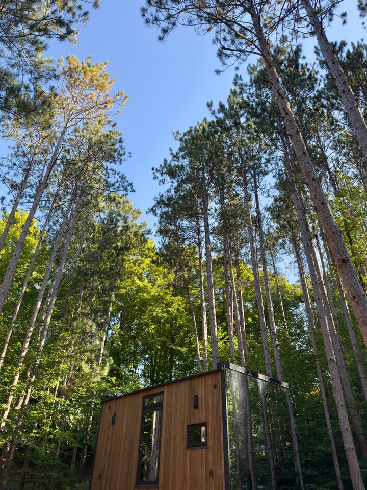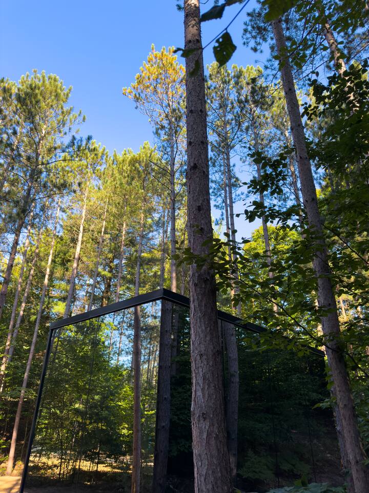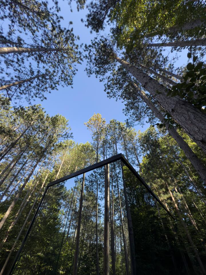 Lumi is a mirror cabin that reflects nature. It sleeps two with a queen bed. It's the ideal romantic getaway or friendship retreat. -It's near Crystal Mountain, on the same land as The Domes of Glamp Michigan. -Soak in the hot tub under the stars. Steam in your private sauna. Brave the cold plunge. -Roast marshmallows by the smokeless fire pit. -Cook outside on the Blackstone or inside with a kitchenette. Full shower and toilet. -Open 365 days a year in stunning Northern Michigan.